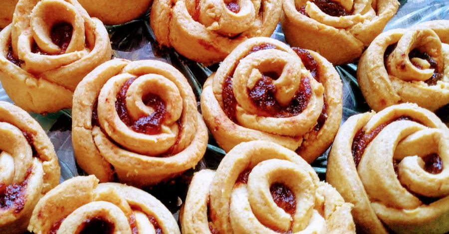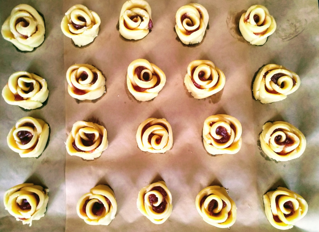 - Układamy je tak, aby zachodziły delikatnie na siebie. Miejsca łączeń najlepiej posmarować białkiem za pomocą pędzelka. Wzdłuż nachodzących na siebie kółek smarujemy cienką warstwę marmolady różanej bądź dżemu różanego.
