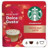 Starbucks® Toffee Nut Latte to świąteczna edycja kawy Toffee Nut Latte serwowanej w kawiarniach Starbucks. Opakowanie zawiera 6 kapsułek z kawą i 6 kapsułek z mlekiem, które razem tworzą wyśmienitą kompozycję. Kapsułki przeznaczone są wyłącznie do przygotowania w ekspresach Nescafe Dolce Gusto.