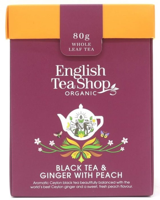 English Tea Shop Black Tea & Ginger With Peach to wysokiej jakości ekologiczna czarna herbata połączona z imbirem i brzoskwinią. Aromatyczna, zbalansowana czarna herbata cejlońska z imbirem i słodkim, świeżym, brzoskwiniowym smakiem. Opakowanie zawiera 80g sypanej herbaty English Tea Shop Black Tea & Ginger With Peach.