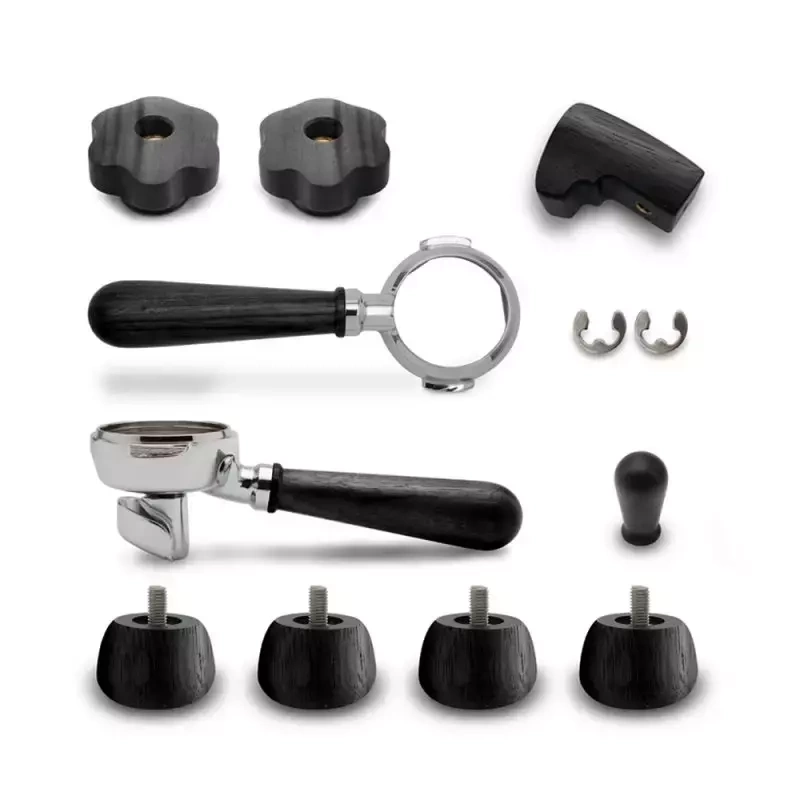 Czarny zestaw drewnianych elementów przeznaczony do ekspresu Lelit Bianca PL162T. Elementy wykonane są z drewna orzecha, co zapewnia wyrafinowany efekt estetyczny i daje przyjemność w dotyku. Zestaw składa się z dwóch pokręteł do dyszy pary i gorącej wody, pokrętła do dźwigni, łopatki i czterech nóżek. Wyposażony jest również w dwie kolby z czarnymi uchwytami z drewna orzechowego w dwóch wersjach: naked i z 2-drożną wylewką do kawy Lelit58. Do zestawu dołączona jest instrukcja montażu.