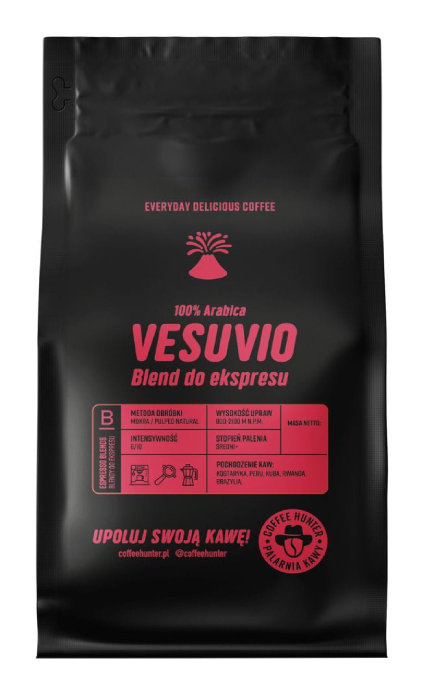 Coffee Hunter Vesuvio Blend to kawa, która świetnie sprawdzi się do przygotowania aromatycznego espresso, ale również zachwyci w postaci kawy z mlekiem.