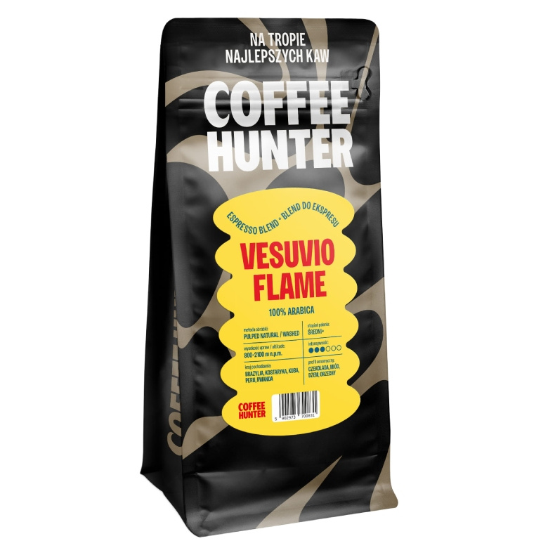 Coffee Hunter Vesuvio Flame to kawa, która świetnie sprawdzi się do przygotowania aromatycznego espresso, ale również zachwyci w postaci kawy z mlekiem.