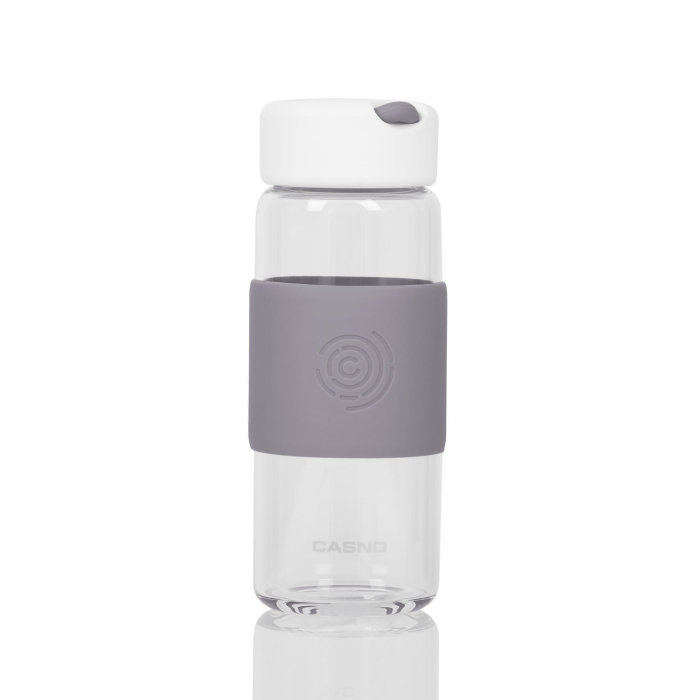 Szklana butelka na wodę Casno Ontario ma pojemność 400 ml i z łatwością zmieści się w każdej torbie lub plecaku. Szara opaska z polipropylenu sprawia, że butelka pewnie trzyma się w dłoni i się nie wyślizguje.