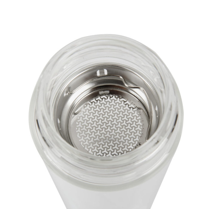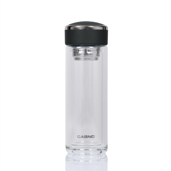Szklana butelka na wodę Casno Claire ma pojemność 300 ml i z łatwością zmieści się w każdej torbie lub plecaku. Dołączony do butelki filtr pozwala przechowywać w niej herbatę liściastą lub wodę z owocami i miętą. W zestawie z butelką znajduje się materiałowy pokrowiec, który zwiększa ochronę butelki przed stłuczeniem.