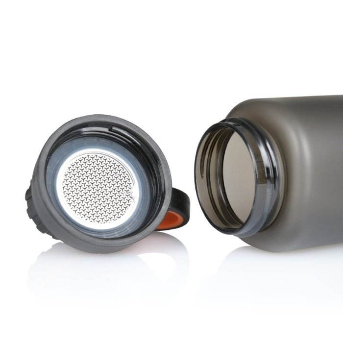 Tritanowa butelka na wodę Casno James Mat pomieści aż 1000 ml napoju i na ściankach posiada miarkę, która ułatwia kontrolę poziomu wody. Butelka posiada filtr, który zatrzymuje stałe cząstki napoju i sprawdzi się np. do przechowywania wody z owocami i miętą.