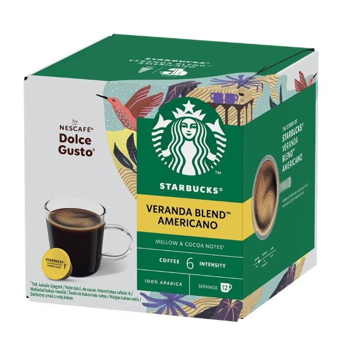 Nescafé Dolce Gusto Starbucks® Grande Veranda Blend to jasno palona stuprocentowa arabika, która jest mieszanką wyjątkowych ziaren z Ameryki Łacińskiej. Veranda Blend to najjaśniej palona kawa mielona od Starbucks, która doskonale sprawdzi się do przygotowania w formie kawy czarnej oraz z dodatkiem mleka. Kapsułki stworzone są do przygotowania w ekspresach kapsułkowych Dolce Gusto.
