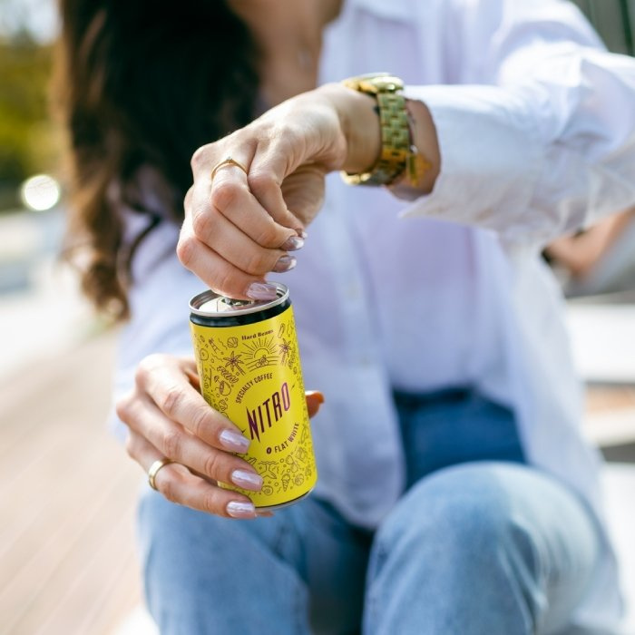 Nitro Flat White Sweet to kremowy napój kawowy, który powstał dzięki ekstrakcji zimną wodą przy zastosowaniu opatentowanej przez Hard Beans technologii Hardtank oraz infuzji ciekłym azotem. Do stworzenia napoju wykorzystano brazylijską arabikę jakości specialty z farmy Samambaia.