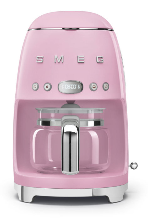 Ekspres do kawy SMEG DCF02PKEU należy do urządzeń linii 50's Style, która designem idealnie wpisuje się w estetykę lat 50. Lśniący korpus wykonany ze stali nierdzewnej, chromowana podstawka, szklany dzbanek do kawy i opływowe kształty sprawiają, że przelewowy ekspres do kawy SMEG DCF02 w kolorze pastelowego różu będzie gwiazdą w każdej kuchni. Urządzenie cechuje się także ponadczasową funkcjonalnością. Na froncie ekspresu znajduje się intuicyjny panel kontrolny składający się z podświetlanych przycisków i wyświetlacza LED. To dzięki nim w prosty sposób dostosujesz twardość wody, intensywnośc kawy czy zaplanujesz automatyczne uruchomienie ekspresu.