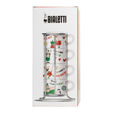 Zestaw 4 filiżanek do cappuccino Bialetti Italia. Kolorowe filiżanki wykonane są z grubej porcelany, prezentują włoskie grafiki Bialetti i posiadają ucho, które ułatwia trzymanie oraz chroni nas przed poparzeniem. Dołączony do zestawu metalowy stojak pozwala ustawiać filiżanki jedna na drugiej, dzięki czemu możemy ekonomicznie zagospodarować przestrzeń. Zestaw sprawdzi się idealnie w domu każdego miłośnika aksamitnego cappuccino.