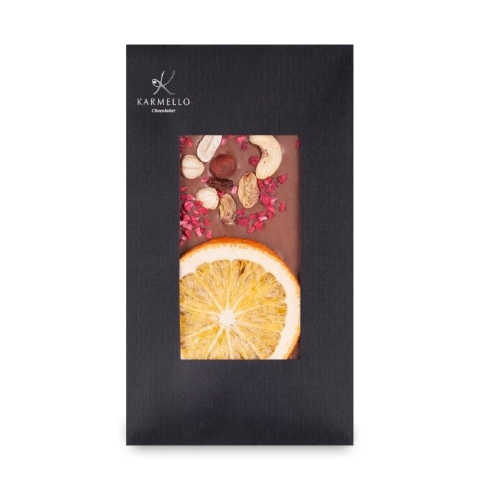 Wysokiej jakości ręcznie robiona czekolada mleczna dekorowana aromatycznymi dodatkami: pomarańczą, liofilizowanymi owocami oraz bakaliami. Czekolada mleczna z pomarańczą Karmello posiada opakowanie z okienkiem, dzięki czemu idealnie sprawdzi się jako słodki dodatek do świątecznego prezentu.