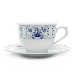 Porcelanowa filiżanka do kawy i herbaty Maria ze zdobionej serii Kaszubska Lubiana. Filiżanka urzeka swoim kształtem i atrakcyjnym projektem. Zdobi ją ludowy motyw kaszubski w odcieniach błękitu i granatu, który świetnie prezentuje się na białym tle. Filiżanka Maria ma pojemność 350 ml i posiada w zestawie porcelanowy spodek.