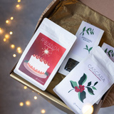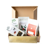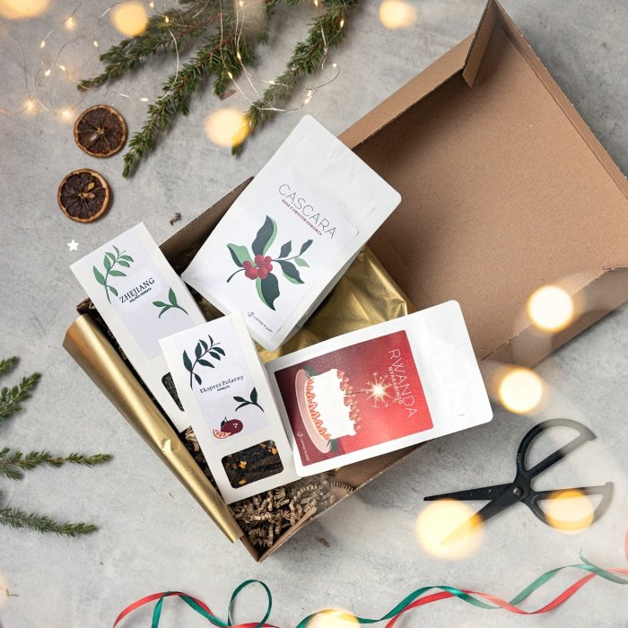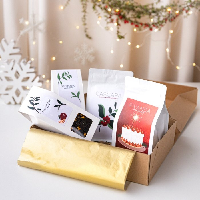 W zestawie znajdują się: Rwanda Nyakabingo 250 g, Cascara Hacienda Sonora 180 g, herbata zielona Zhejiang 80 g oraz mieszanka herbat Ekspres Polarny 80 g. Całość zapakowana w karton ze świąteczną naklejką i złotą bibułkę.