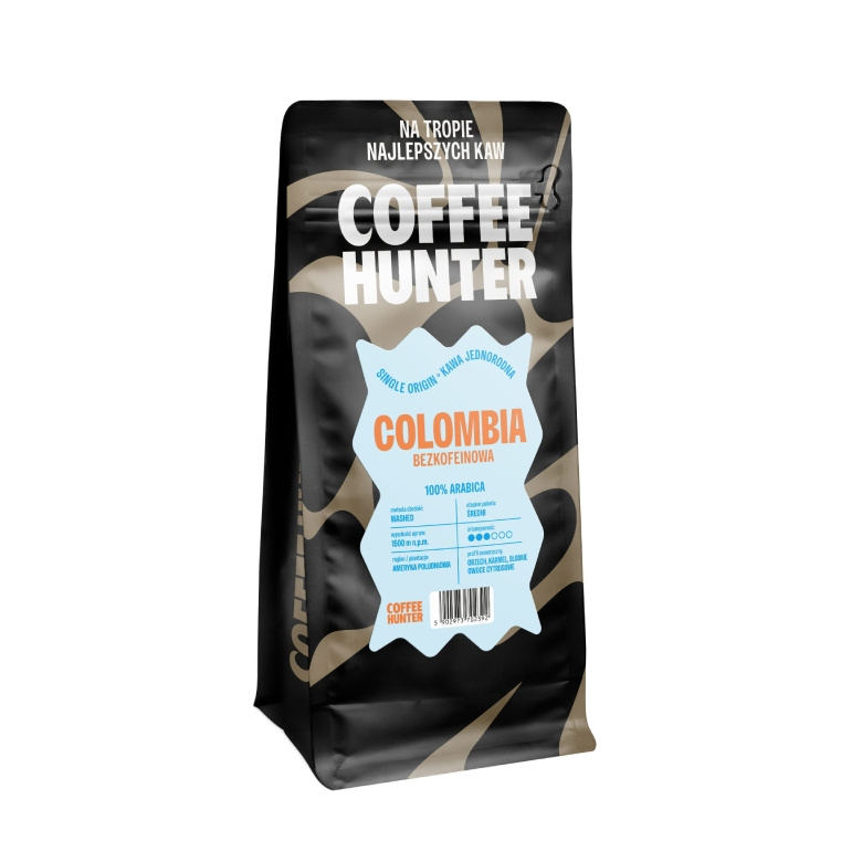 Coffee Hunter Colombia Bezkofeinowa to średnio palona kolumbijska arabika Single Origin pozbawiona kofeiny. Jej ziarna rosną na wysokości 1500 m n.p.m. i są poddawane obróbce washed. Odpowiedni stopień wypalenia sprawia, że jest to kawa idealna do ekspresów ciśnieniowych i kawiarek. Bezkofeinowa Colombia, to po prostu Colombia Excelso pozbawiana kofeiny w procesie płukania wodą tzw. Swiss of Water. Jest to metoda całkowicie naturalna. Idealne rozwiązanie dla osób lubiących picie kawy bez przerw.