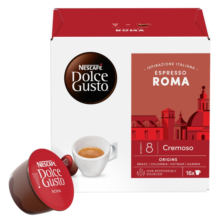 Nescafé Dolce Gusto Espresso Roma to kawa w kapsułkach, która pozwala w mgnieniu oka przygotować intensywne espresso. Opakowanie zawiera 16 kapsułek z wysokiej jakości kawą. Do przygotowania kawy Espresso polecamy filiżanki o pojemności 50 ml. Kapsułki stworzone są do przygotowania w ekspresach kapsułkowych Dolce Gusto.