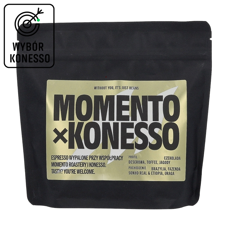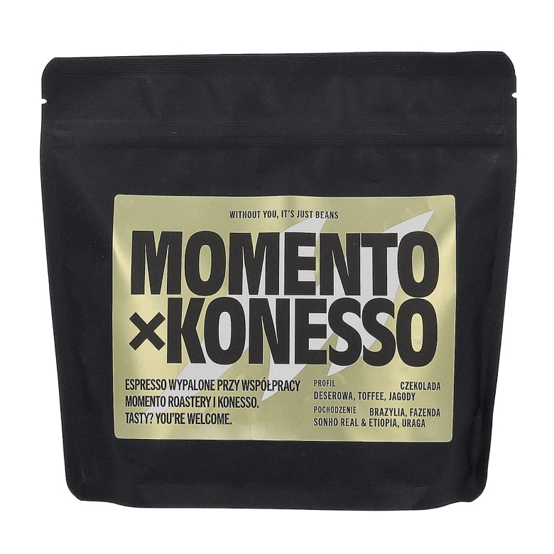 Momento Konesso Blend to pierwsza kawa, która powstała we współpracy sklepu Konesso.pl i rzeszowskiej palarni kawy Momento. Jest to średnio palona mieszanka arabiki z Brazylii (Fazenda Sonho Real, Cerrado) i Etiopii (Uraga, Guji) w proporcji 50/50 przeznaczona do ekspresów ciśnieniowych. Brazylijskie ziarna to arabika odmiany Yellow Catuai poddana obróbce Natural, a etiopskie, to odmiana Heirloom po obróbce Washed.