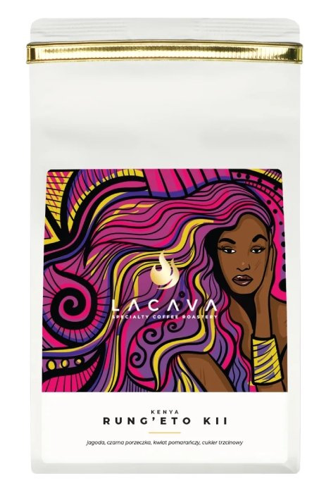 LaCava Kenia Rung'eto Kii to jasno palona arabika Single Origin z Kenii stworzona do przelewowych metod parzenia. Tworzą ją ziarna odmian SL-34, SL-28, Baitan, Ruiru 11, które rosną na wysokościach 1600-1800 m n.p.m. w regionie Kirinyaga i przechodzą obróbkę metodą washed. LaCava Kenia Rung'eto Kii to kawa jakości specialty, która w teście jakości otrzymała 88 punktów.