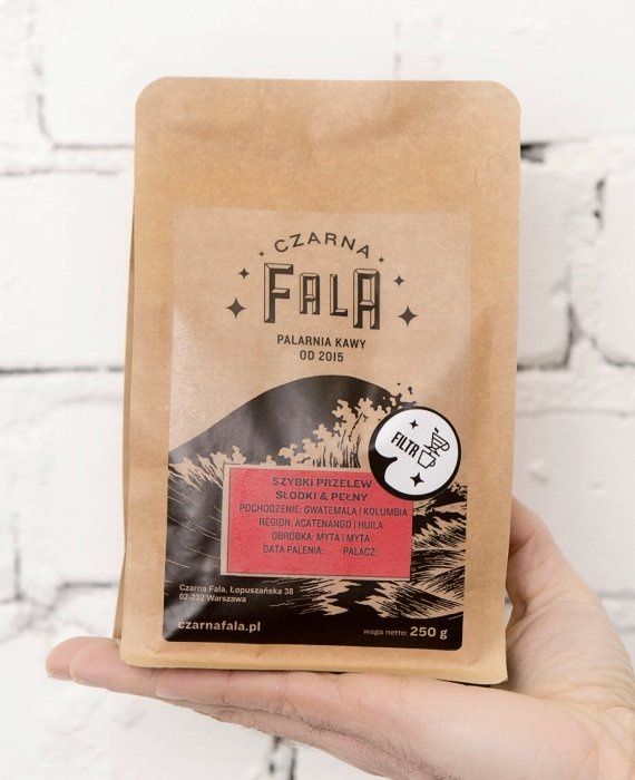 Czarna Fala Szybki Przelew - SŁODKI I PEŁNY to średnio palona kawa z serii przeznaczonej do ekspresów przelewowych. Jest to mieszanka ziaren z Rwandy (myta - bourbon, jackson - 84 pkt) i Brazylii (natural - mundo novo - 85 pkt). Ziarna zostały wypalone nieco ciemniej, niż standardowe kawy pod filtr, ale jaśniej, niż kawy do espresso.