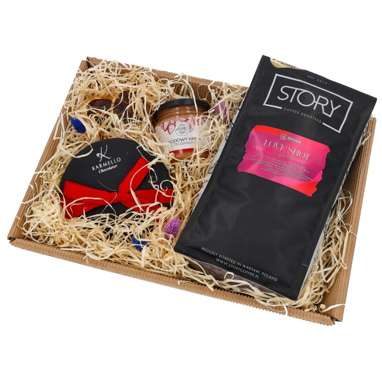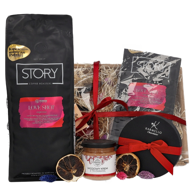 Zestaw prezentowy zamknięty jest w koszu wypełnionym atrakcyjnym materiałem zabezpieczającym oraz ozdobami. Zestaw jest zamknięty zgrzaną folią, a dla maksymalnego bezpieczeństwa jest dodatkowo zapakowany w karton. Dzięki temu zestaw prezentuje się elegancko i jest od razu gotowy do wręczenia.