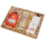 Zestaw prezentowy zamknięty jest w koszu wypełnionym atrakcyjnym materiałem zabezpieczającym oraz ozdobami. Zestaw jest zamknięty zgrzaną folią a dla maksymalnego bezpieczeństwa jest dodatkowo zapakowany w karton. Dzięki temu zestaw prezentuje się elegancko i jest od razu gotowy do wręczenia.