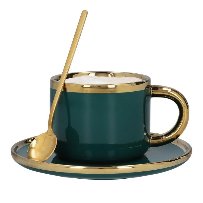Zielono-złota filiżanka ma duże, wygodne ucho. W komplecie posiada spodek w tym samym odcieniu oraz stylową łyżeczkę o delikatnym kształcie. Filiżankę ozdabia pas w kolorze złota, który znajduje się również na krawędzi spodka. Zestaw należy myć ręcznie i nie można używać w kuchence mikrofalowej. Pojemność produktu liczy 250 ml.