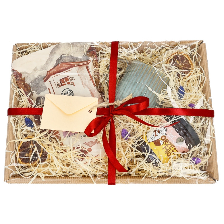Zestaw prezentowy zamknięty jest w koszu wypełnionym atrakcyjnym materiałem zabezpieczającym oraz ozdobami. Zestaw jest zamknięty zgrzaną folią a dla maksymalnego bezpieczeństwa jest dodatkowo zapakowany w karton. Dzięki temu zestaw prezentuje się elegancko i jest od razu gotowy do wręczenia.