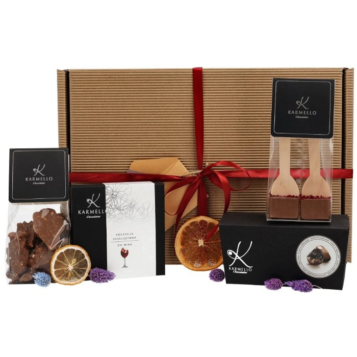 Kolekcja czekoladek do wina Karmello to propozycja dla miłośników wyszukanych smaków. Wyjątkowa kolekcja czekoladek z posypkami o smaku chilli, pieprzu, gałki muszkatałowej i kakao, które podkreślą smak każdego wina. Pięknie ozdobione czekoladki do wina są zapakowane w eleganckie pudełko i wspaniale dopełniają zestaw. Przecież mężczyźni uwielbiają czekoladę! Opakowanie zawiera 16 czekoladek, 130g.