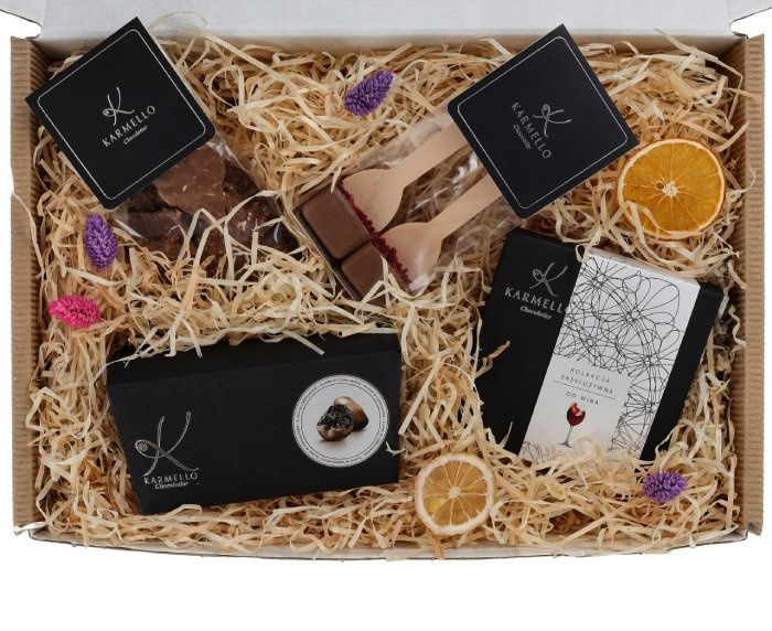 Zestaw prezentowy zamykany jest w karton wypełniony atrakcyjnym materiałem zabezpieczającym oraz ozdobami. Zamknięty zestaw dla maksymalnego bezpieczeństwa jest dodatkowo pakowany w karton. Dzięki temu zestaw prezentuje się elegancko i jest od razu gotowy do wręczenia.