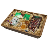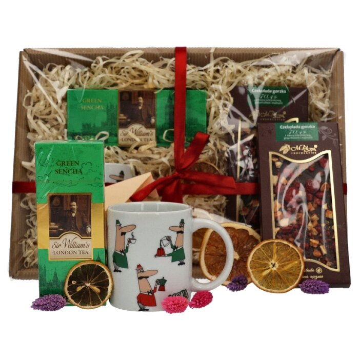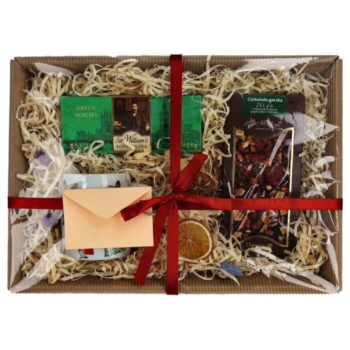 Zestaw prezentowy zamknięty jest w koszu wypełnionym atrakcyjnym materiałem zabezpieczającym oraz ozdobami. Zestaw jest zamknięty zgrzaną folią a dla maksymalnego bezpieczeństwa jest dodatkowo zapakowany w karton. Dzięki temu zestaw prezentuje się elegancko i jest od razu gotowy do wręczenia.
