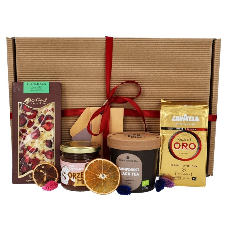 Zestaw prezentowy zamykany jest w karton wypełniony atrakcyjnym materiałem zabezpieczającym oraz ozdobami. Zamknięty zestaw dla maksymalnego bezpieczeństwa jest dodatkowo pakowany w karton. Dzięki temu zestaw prezentuje się elegancko i jest od razu gotowy do wręczenia.