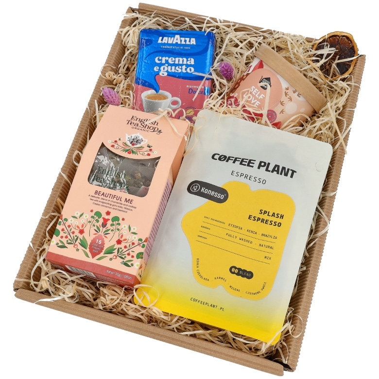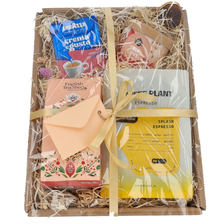 Zestaw prezentowy zamknięty jest w koszu wypełnionym atrakcyjnym materiałem zabezpieczającym oraz ozdobami. Zestaw jest zamknięty zgrzaną folią a dla maksymalnego bezpieczeństwa jest dodatkowo zapakowany w karton. Dzięki temu zestaw prezentuje się elegancko i jest od razu gotowy do wręczenia.