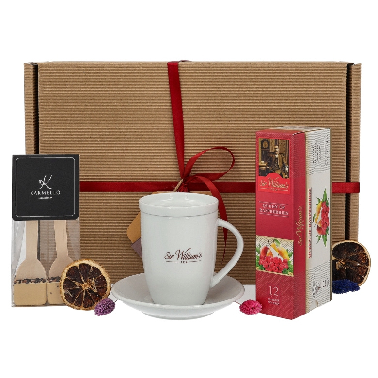 Kubek Sir Williams z przykrywką i spodkiem z logo Sir William's jest wykonany z porcelany. Przykrywka na dłużej utrzymuje odpowiednią temperaturę herbaty i może posłużyć jako miejsce na zaparzoną saszetkę. Kubek ma pojemność 200 ml.