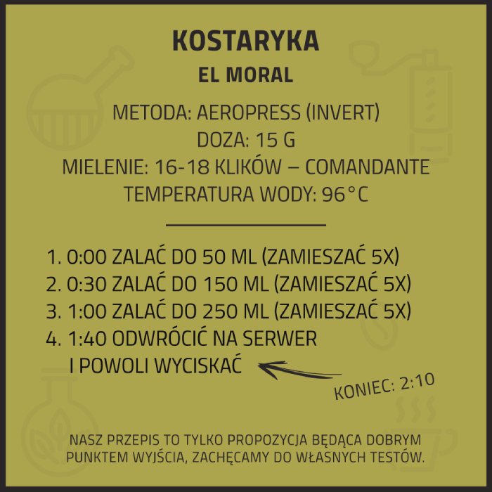 Coffeelab Kostaryka El Moral została wypalona z myślą o przelewowych metodach parzenia, dlatego polecamy przygotować ją w zaparzaczu drip lub Chemex. Świetnie sprawdzi się także jako kawa do ekspresu przelewowego i AeroPressu.