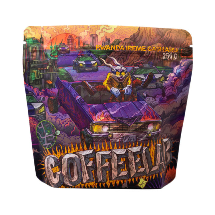 Coffeelab Rwanda Ireme Gasharu charakteryzuje się wysoką kwasowością oraz wyraźnymi nutami czerwonych owoców, które są wspaniałym dopełnieniem smaku egzotycznego mango. Słodyczy kawie nadają owoce winogrona. Wspaniały projekt opakowania został wykonany przez LIS KULA.
