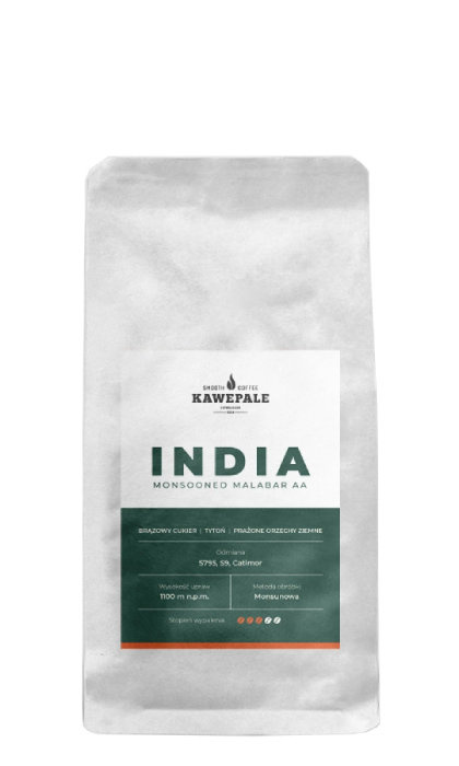 KawePale India Monsooned Malabar AA charakteryzuje się aromatem prażonych orzechów ziemnych, tytoniu i brązowego cukru.