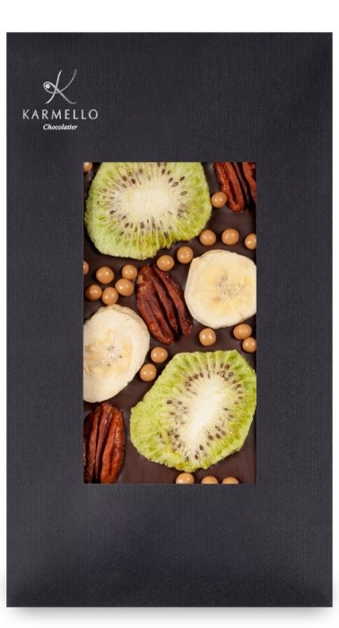 Wysokiej jakości ekskluzywna, ręcznie robiona delikatna tabliczka ciemnej belgisjkiej czekolady, ozdobiona kawałkami liofilizowanego kiwi, banana, orzeszkami pekan oraz płatkami zbożowymi zanurzonymi w czekoladzie. Całość została starannie zapakowana w eleganckim pudełku z przezroczystym okienkiem.