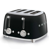 Czarny toster SMEG został zaprojektowany z dbałością o najmniejsze detale. Obudowa urządzenia jest wykonana z trwałej stali lakierowanej, a stabilna podstawa oraz pokrętło regulujące moc grzałki są chromowane. Toster jest wyposażony w ergonomiczną dźwignię aktywującą cykl, a także szerokie kieszenie, które pomieszczą kromki i przekrojone na pół bułki. Całość została utrzymana w wyjątkowej estetyce w stylu lat 50.