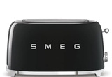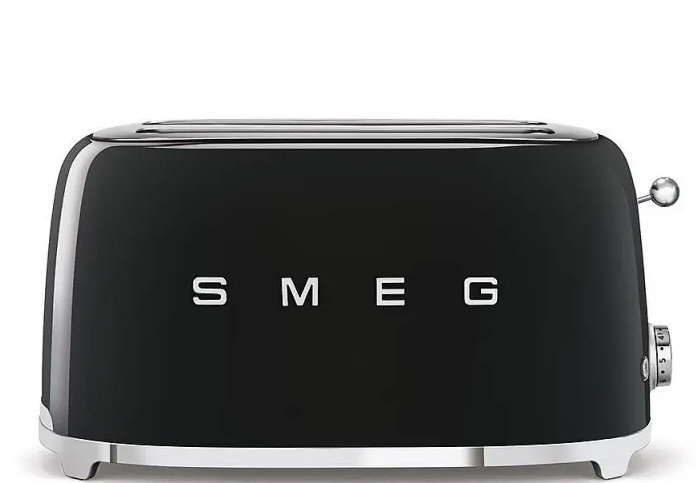 Czarny toster SMEG został zaprojektowany z dbałością o najmniejsze detale. Obudowa urządzenia jest wykonana z trwałej stali lakierowanej, a stabilna podstawa oraz pokrętło regulujące moc grzałki są chromowane. Toster jest wyposażony w ergonomiczną dźwignię aktywującą cykl, a także szerokie kieszenie, które pomieszczą kromki i przekrojone na pół bułki. Całość została utrzymana w wyjątkowej estetyce w stylu lat 50.