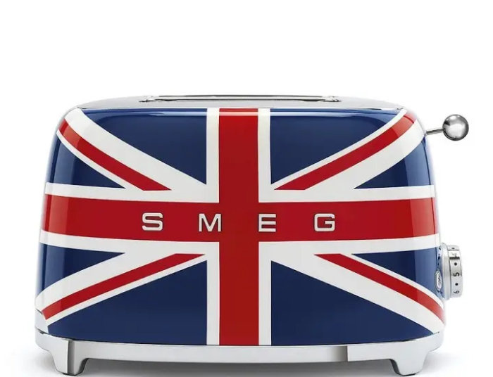 Toster SMEG został zaprojektowany z dbałością o najmniejsze detale. Obudowa urządzenia jest wykonana z trwałej stali lakierowanej w barwy flagi Wielkiej Brytanii, a stabilna podstawa oraz pokrętło regulujące moc grzałki są chromowane. Toster jest wyposażony w ergonomiczną dźwignię aktywującą cykl, a także szerokie kieszenie, które pomieszczą kromki i przekrojone na pół bułki. Całość została utrzymana w wyjątkowej estetyce w stylu lat 50.