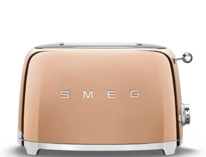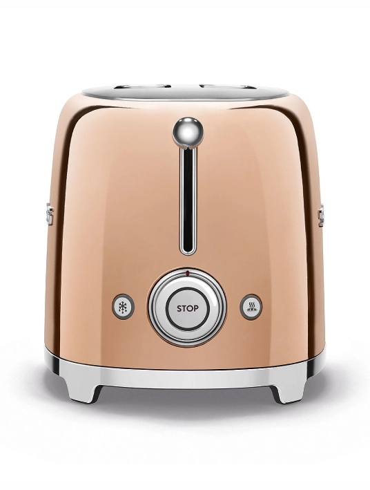 Złoty toster SMEG został zaprojektowany z dbałością o najmniejsze detale. Obudowa urządzenia jest wykonana z trwałej stali lakierowanej, a stabilna podstawa oraz pokrętło regulujące moc grzałki są chromowane. Toster jest wyposażony w ergonomiczną dźwignię aktywującą cykl, a także szerokie kieszenie, które pomieszczą kromki i przekrojone na pół bułki. Całość została utrzymana w wyjątkowej estetyce w stylu lat 50.