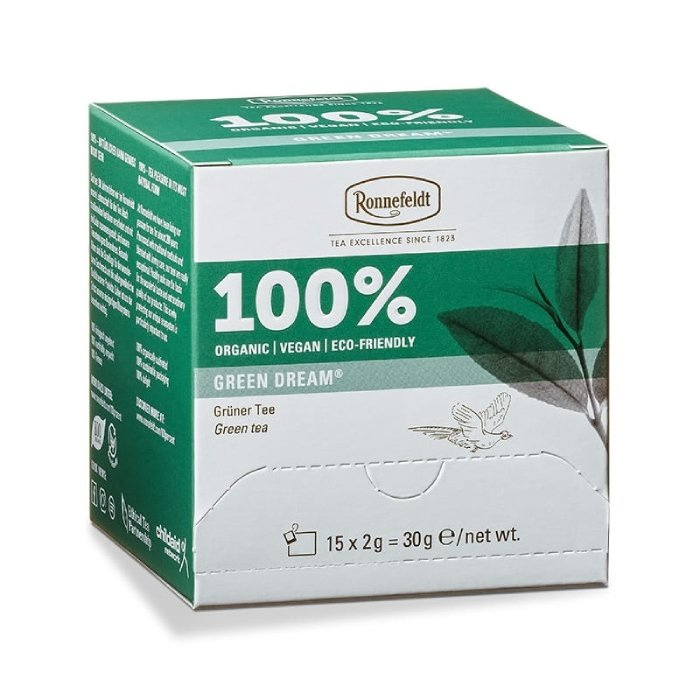 Opakowanie zawiera 15 saszetek z zieloną herbatą Ronnefeldt 100% Green Dream.