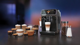Automatyczny spieniacz mleka LatteGo zrobi idealną piankę mleczną do kawy. Z trwałym ceramicznym młynkiem mielenie przebiega niezwykle cicho. W eskpresie Philips EP5444/50 możesz ustawić moc kawy w 5 stopniach, temperaturę w 3 stopniach oraz zapisać swoje ulubione przepisy w jednym z czterech profili użytkownika. Dzięki wygodnemu wyświetlaczowi dotykowemu obsługa przebiega szybko i prosto.