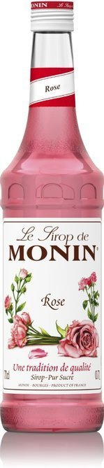 Różany syrop francuskiego producenta MONIN w szklanej butelce o pojemności 0,7 litra. Charakteryzuje się jaskraworóżową barwą i wyjątkowym smakiem płatków róży oraz intensywnym aromatem kwiatów. Można go stosować jako dodatek do koktajli, napojów owocowych, win, mlek smakowych, kawy i herbaty. Już mała ilość tego syropu odmieni przyrządzany napój, nadając mu wyjątkowy różany smak.
