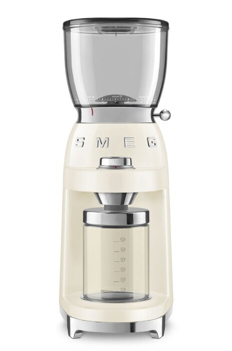 SMEG CGF11CREU to włoskiej produkcji wysokiej jakości elektryczny młynek do kawy, który doskonale sprawdzi się w każdym domu. Młynek należy do urządzeń linii 50's Style, która designem idealnie wpisuje się w estetykę lat 50. Lakierowany korpus ze stali nierdzewnej w kolorze kremowym, chromowana podstawa i opływowe kształty sprawiają, że młynek elektryczny SMEG CGF11 będzie gwiazdą w każdej kuchni.