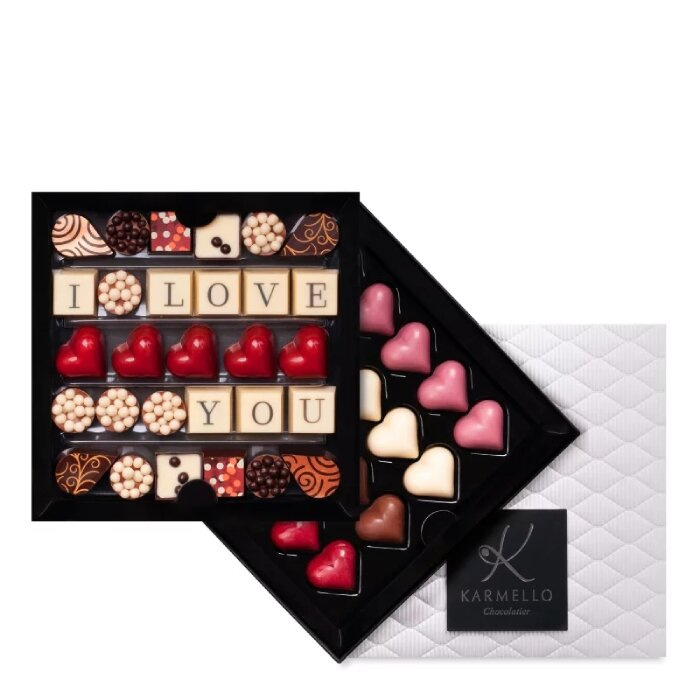 Podwójny Zestaw Karmello to idealny prezent dla bliskiej osoby. Zestaw zawiera pięknie zapakowaną kolekcję Czekoladowych Serduszek - aksamitnych w smaku czekoladek w kształcie serduszek oraz opakowanie literowych czekoladek, które tworzą uroczy napis "I love you". Zestaw jest zapakowany w eleganckie opakowanie.
