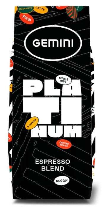 Gemini Platinum Espresso to średnio palona mieszanka arabiki z Brazylii i Kolumbii (90%) oraz indyjskiej robusty (10%). Kawa ziarnista Gemini Platinum Espresso jest kawą polecaną do przygotowywania metodami ciśnieniowymi: w ekspresie automatycznym, kolbowym, kawiarce czy tradycyjną metodą.