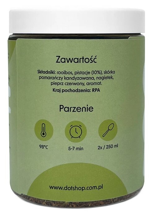 Składniki: rooibos, pistacje (10%), skórka pomarańczy kandyzowana, nagietek, pieprz czerwony, aromat.