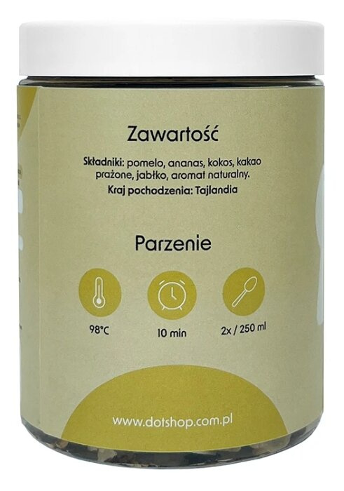 Składniki: Pomelo, ananas, kokos, kakao prażone, jabłko, aromat naturalny.