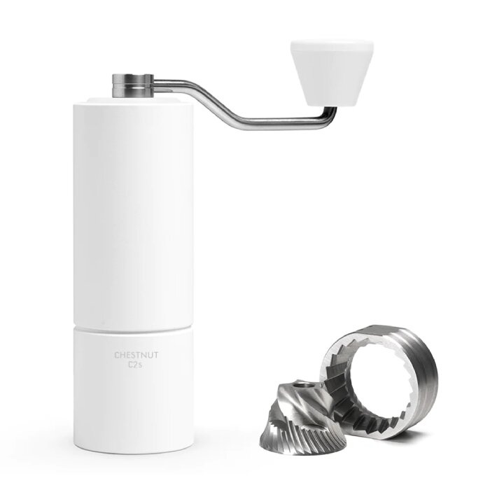 Timemore Chestnut C2s w kolorze białym z nieskładaną rączką to następca młynka C2 i tym razem dostał w pełni metalową obudowę. Młynek do kawy Timemore Chestnut C2S łączy w sobie elegancję, wytrzymałość i precyzję, stając się niezastąpionym narzędziem dla każdego miłośnika kawy. Wykonany w całości z metalu, z użyciem technologii CNC jest solidny i trwały. Młynek posiada stalowe żarna stożkowe, które zapewniają jednolite mielenie ziaren kawy idealne dla różnych metod parzenia, od espresso po mokę czy French Press.