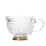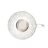 Eleganckie żlobienia na filiżance układają się w okręgi, nadają jej ponadczasowości, a światło pięknie się od nich odbija podkreślając co jest w środku. Lemoniada, herbata, kawa i inne napoje prezentują się w niej naprawdę wyjątkowo, nóżka w kolorze starego złota dodaje jej uroku. Filiżanka ma wygodne ucho. Pojemność naczynia wynosi 360 ml.