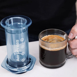 To małe, niepozorne urządzenie pozwala na eksperymentowanie z kawą - czas parzenia, temperatura wody czy stopień zmielenia kawy, to wszystko wpływa na końcowy smak naparu podanego w filiżance. Jednorazowo w AeroPresie można przygotować maksymalnie około 250 ml kawy, o tym jak przygotować kawę w AeroPresie pisaliśmy w naszej bazie wiedzy. W zestawie z AeroPressem Clear znajduje się: plastikowe sitko, mieszadełko, łyżeczka, 50 jednorazowych papierowych filtrów.